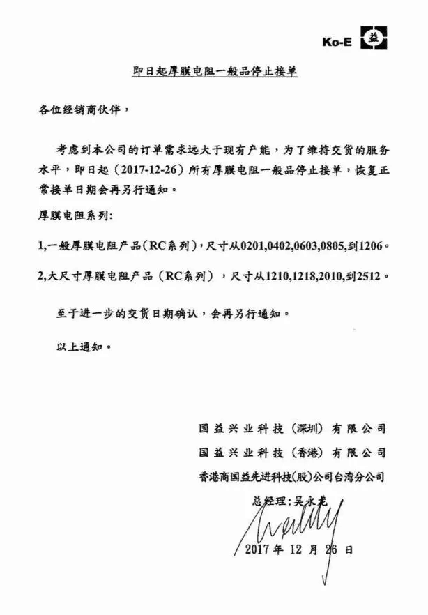 2017年4月19日,國(guó)巨向代理商和客戶發(fā)函宣布,晶片電阻R-CHIP和晶片電容MLCC價(jià)格調(diào)整。函件顯示,由于多項(xiàng)目原材料以及包材價(jià)格持續(xù)攀升,加上新臺(tái)幣大幅度升值,造成公司營(yíng)運(yùn)成本上面面臨極大壓力。因此,經(jīng)鄙司謹(jǐn)慎考慮后,為適度反映成本以穩(wěn)定后續(xù)供給,自即日起,鄙司將針對(duì)新訂單進(jìn)行價(jià)格調(diào)整,具體進(jìn)行價(jià)格調(diào)整的品項(xiàng)以及調(diào)整幅度,鄙司的業(yè)務(wù)團(tuán)隊(duì)會(huì)與貴司進(jìn)行討論和定案。
